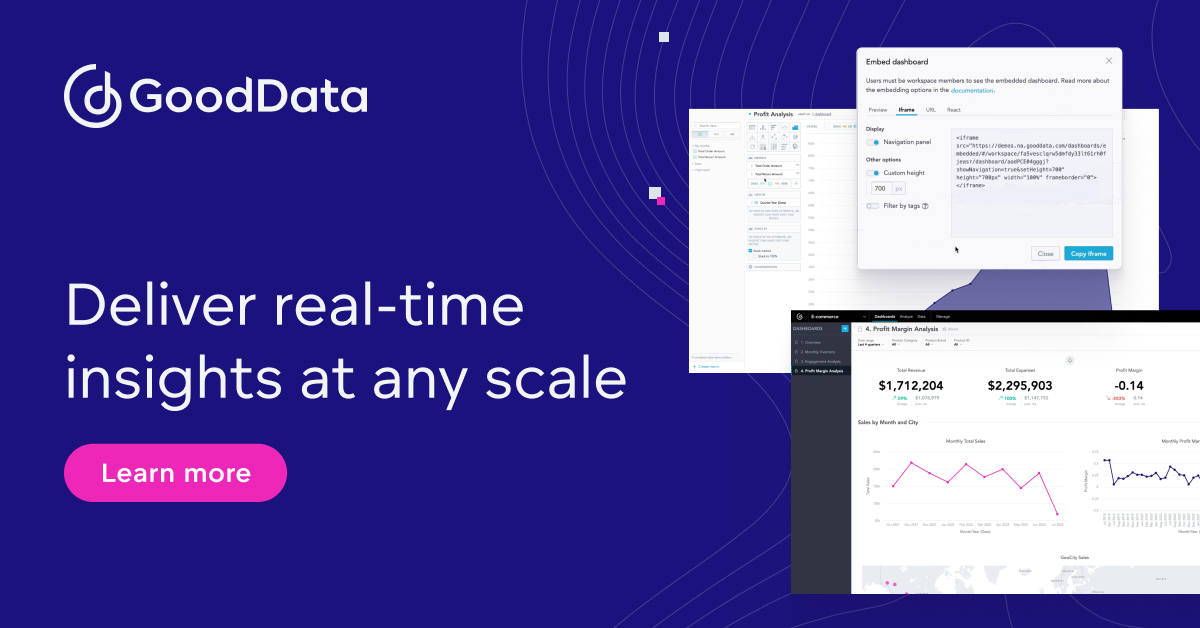 GoodData is a BI and data analytics platform built to create real-time dashboards and low-code/no-code analytics applications with open APIs.